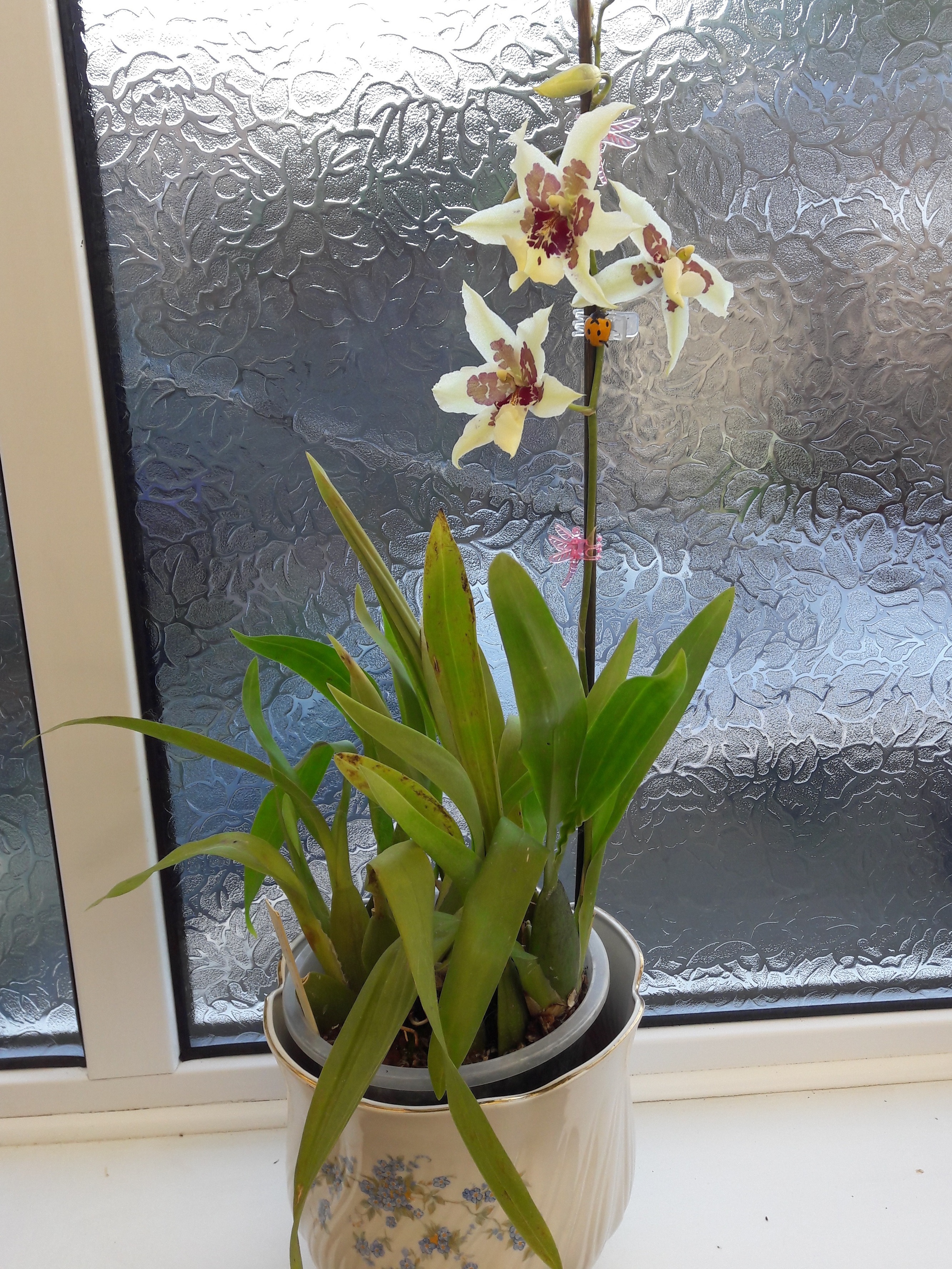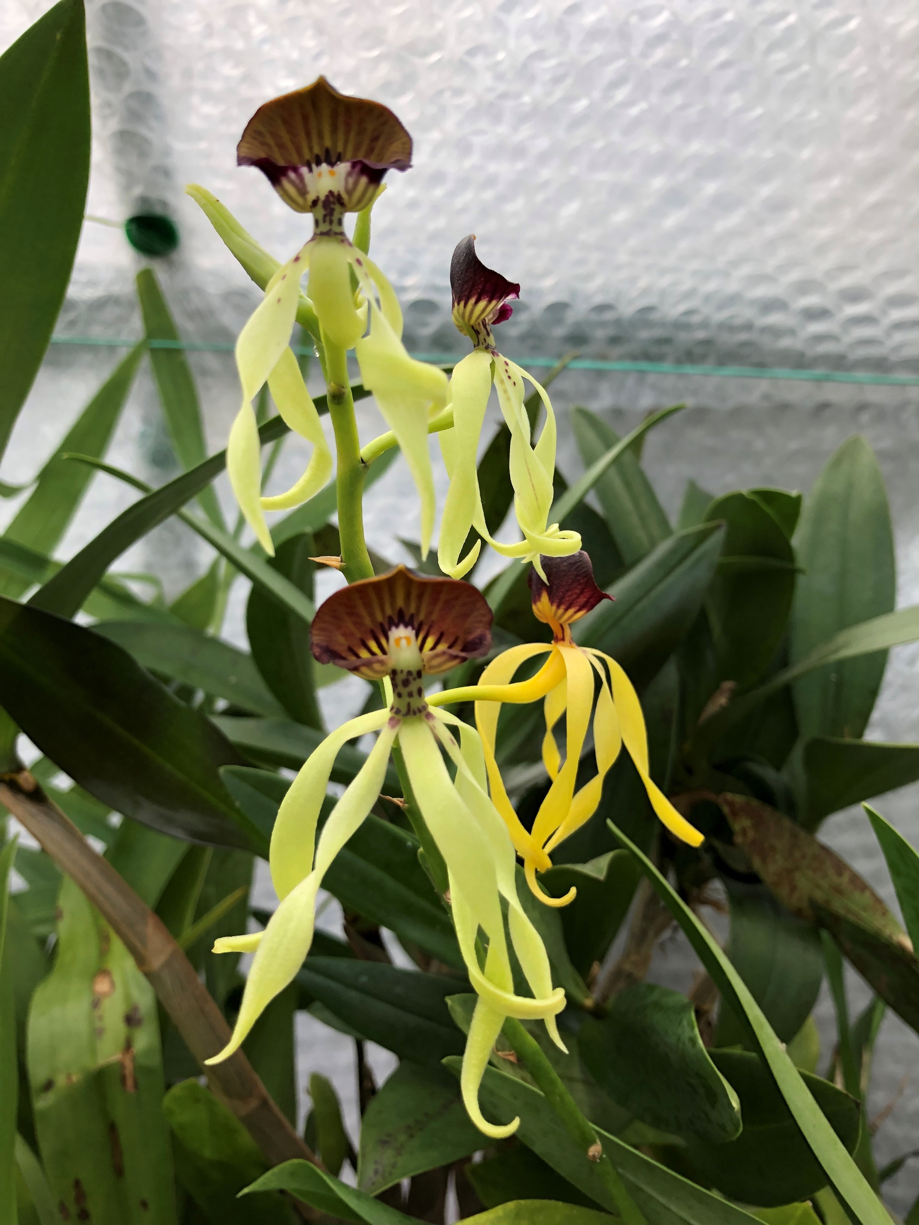 A different Brascidostele (or Bankfieldara) Gilded Tower 'Mystic Maze' and an Epidendrum radicans grown by another member: